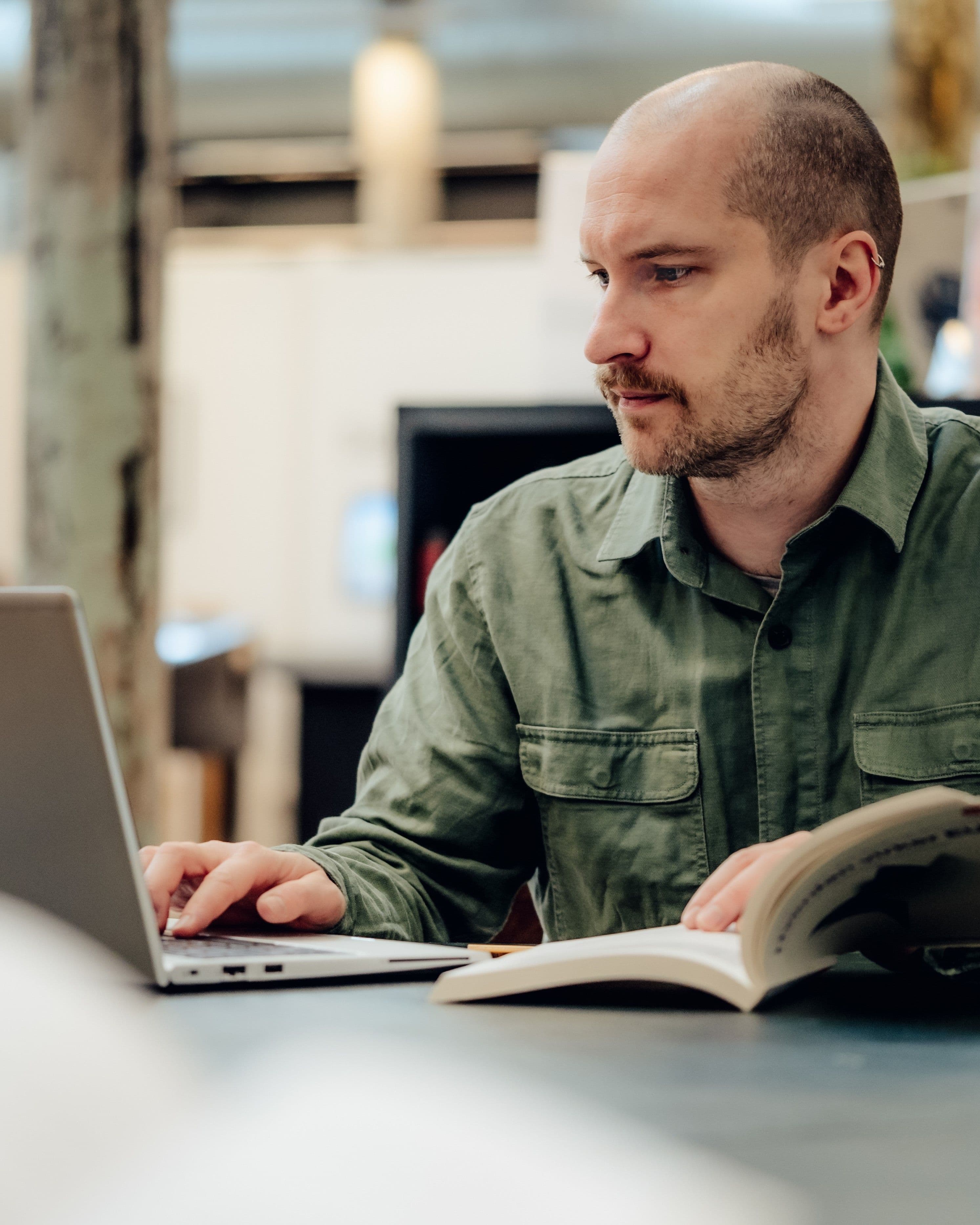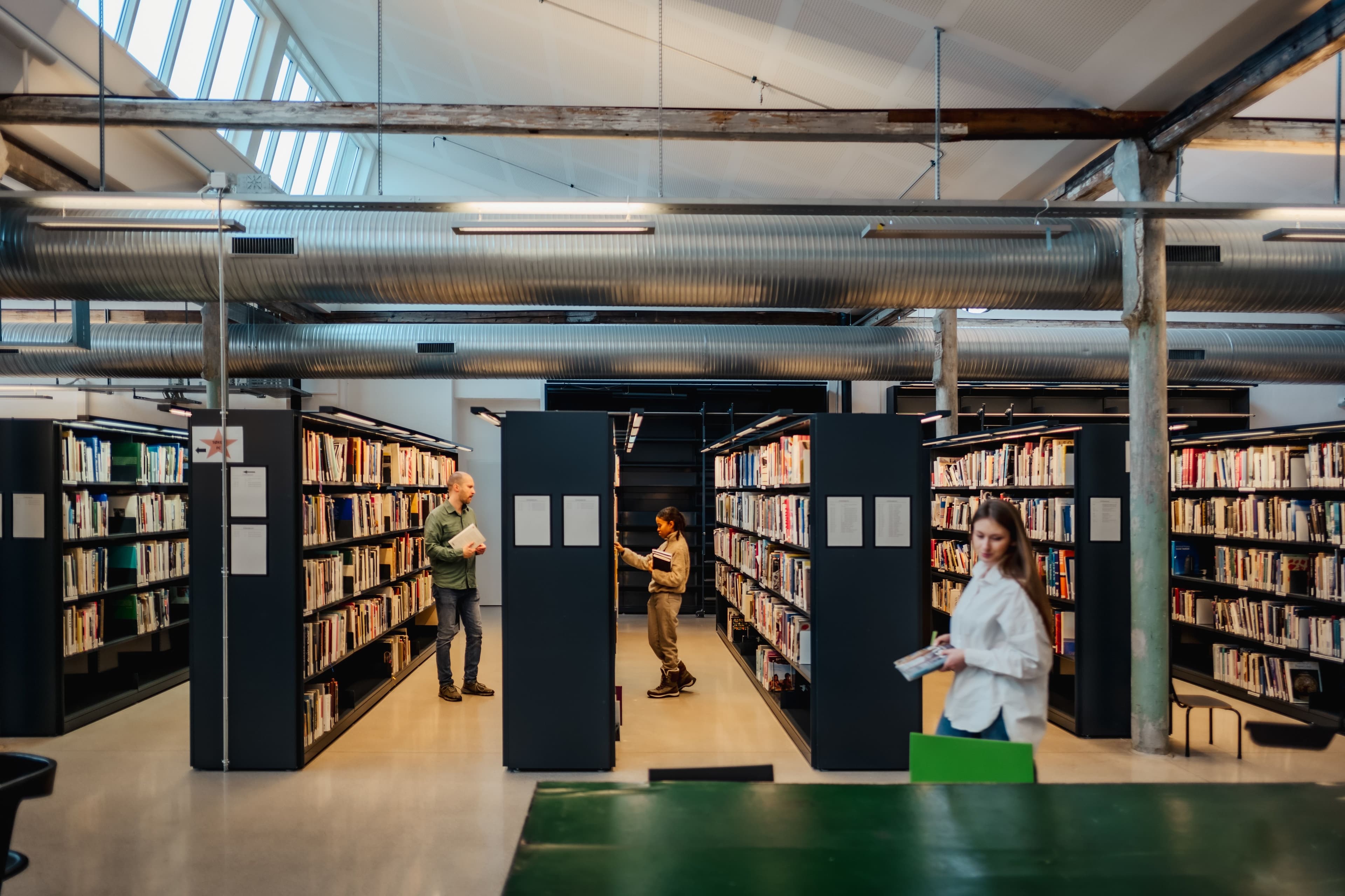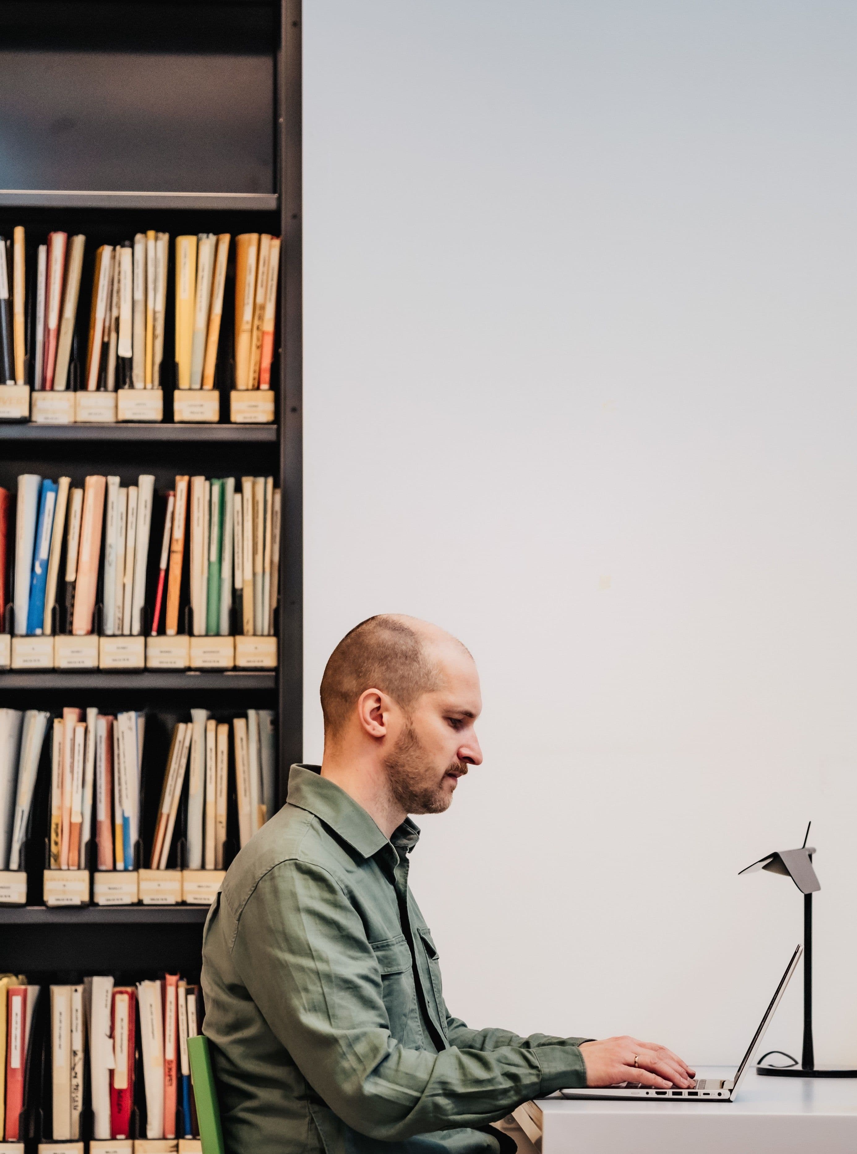 Mann på bibliotek